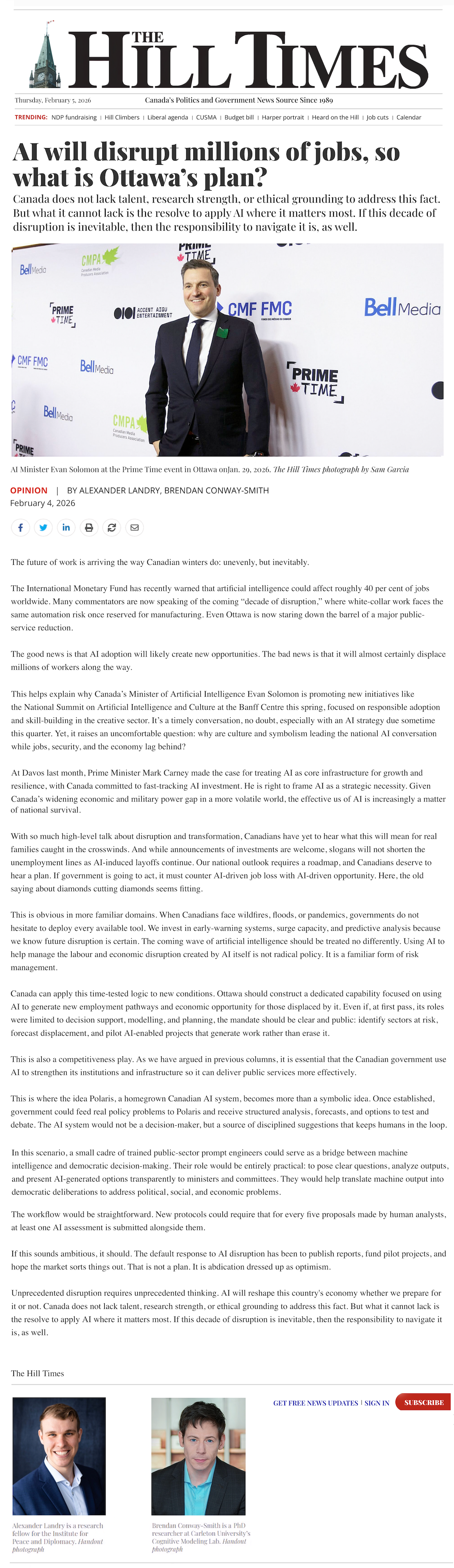 Feb. 4th, 2026 - We argue that AI is set to disrupt millions of jobs, and Ottawa needs a real plan. That means treating AI as a core public infrastructure and building a dedicated capacity inside government to support workforce transitions and reduce the social and economic shocks that will follow. Co-authored with Alex Landry.